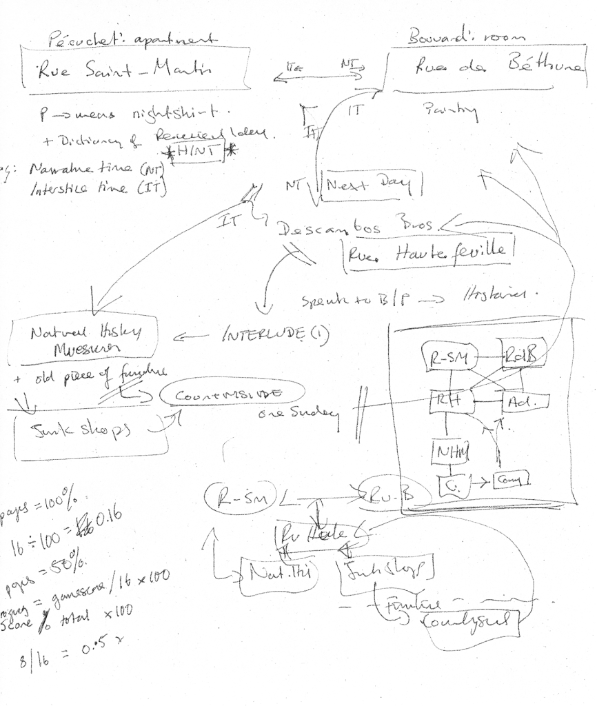 However, in the manner of Bouvard and Pécuchet themselves, the undertaking in the programming itself was far too elaborate from the start. An online software, Quest, allowed for an essentially Boolean approach to coding the game. At the backend, the coding is full of logic gates (‘if x…’, ‘if not x… then…’, ‘if x and y… then…’ etc.), which becomes increasingly layered as you allow for the player to move at between the other linear nature of the text from the original novel (which requires a certain chronology to allow the narrative to unfold). Matters were only exacerbated an attempt to update the novel, enabling the player select from three gender positions. Given the game can be played from either the point of view of Bouvard or Pécuchet, and with three gender positions, the complex enough coding for the narrative unfolding is layered six-fold. There are numerous freely available softwares for building ‘interactive fiction’, which would have made the job much easier, but, these restrict to a simple narrative unfolding, rather than allow for both a temporal narrative and a ‘spacial text’.