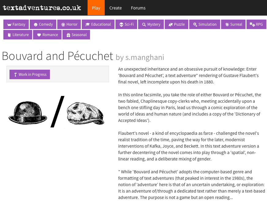 An initial foray into the world of programming began during the UK’s covid lockdown, with a failed endeavour to render Gustav Flaubert’s final novel, Bouvard and Pécuchet (1881) into the form of an online text adventure game. For for anyone who knows the novel, the game sought to metonymically repeat the continual failed exploits of the novel’s two protagonists (see below). Hence, the ‘failure’ of the project was always actually intended, with its undoing to be deliberately built into the game from the start.
