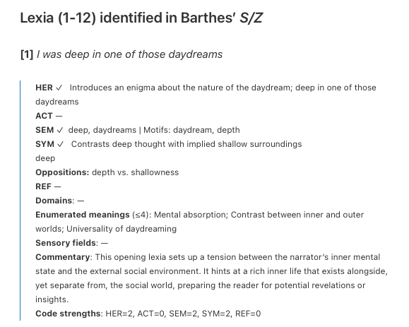 The two readings are then compared side by side (→ see: summary of the alignment of lexia between the script and Barthes’ original set). The comparison is intended to show how interpretive emphasis shifts with granularity, and which ‘hinges’ of meaning remain stable regardless of how the paragraph is starred.