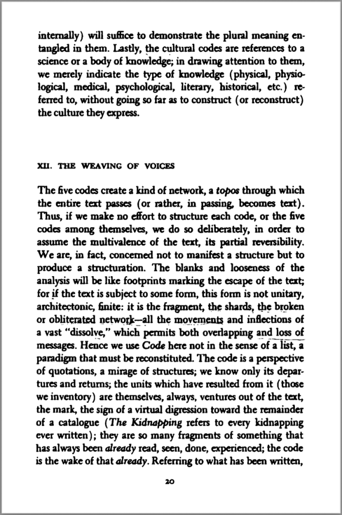Barthes’ commentary purposefully breaks the ‘natural’ flow of narration to create these observational spaces, then tracks how the five codes interweave to produce a structuration rather than expose one master structure.