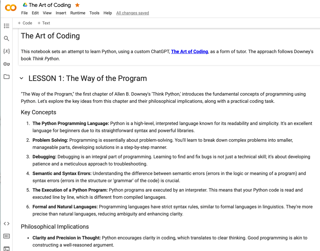 This project sets the problem of an art professor seeking to learn to code; to ‘think like a computer scientist’. Developed as a form of ‘open training’, the project involves using a custom ChatGPT, The Art of Coding, which acts as a Python ‘tutor’. A key text associated with the GPT is the book How to Think Like a Computer Scientist (PDF version). The book provides the necessary structure and framing for a ‘course’ in learning to code. It also offers some wider philosophical considerations, which the GPT is instructed to amplify.