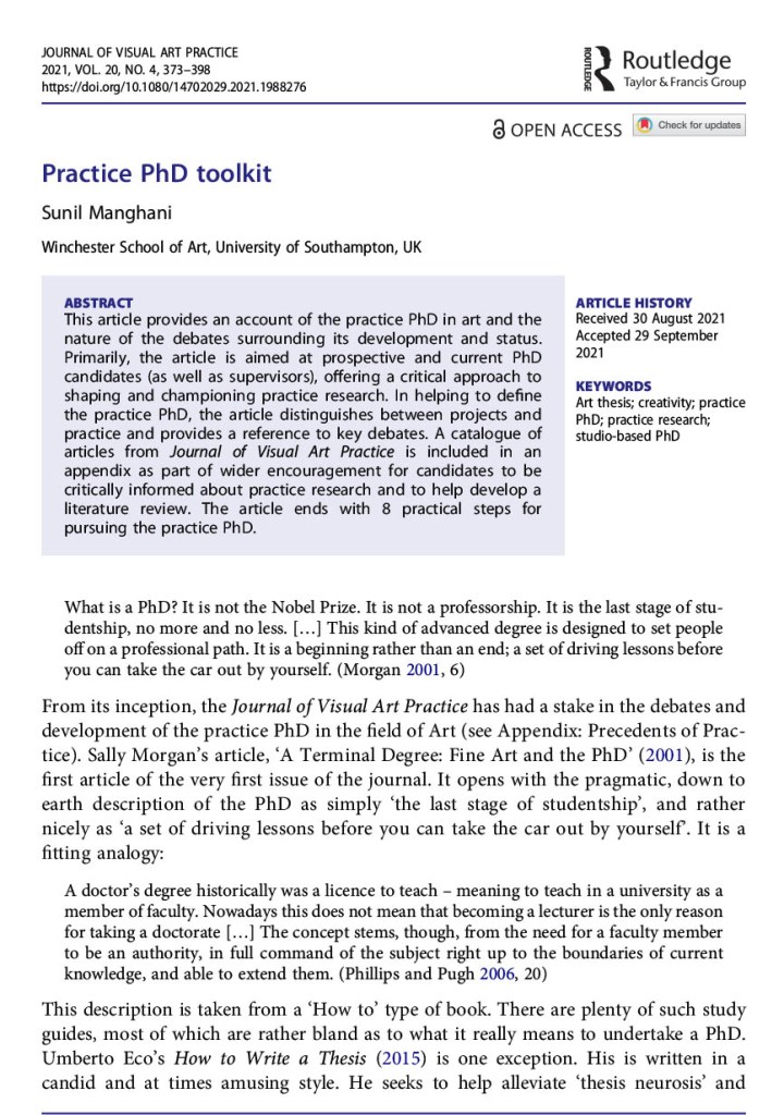 - ‘Practice PhD Toolkit‘, Journal of Visual Art Practice, Vol. 20, No. 4., 2021, pp.373-398.