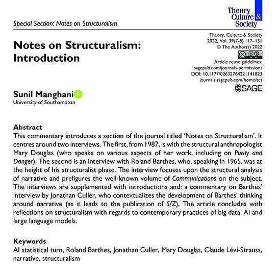 - ‘Notes on Structuralism: Introduction‘, Theory, Culture & Society, Vol. 39, No. 7–8, pp.117–131. Introduction to a special section, including the English translation of ‘On Narrative: An Interview with Roland Barthes‘, pp.159–174.