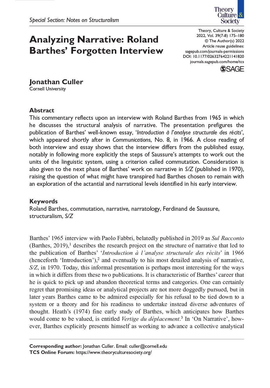 Jonathan Culler (2022) ‘Analyzing Narrative: Roland Barthes’ Forgotten Interview‘, Theory, Culture & Society, Vol. 39, No.7-8, pp. 175–180.