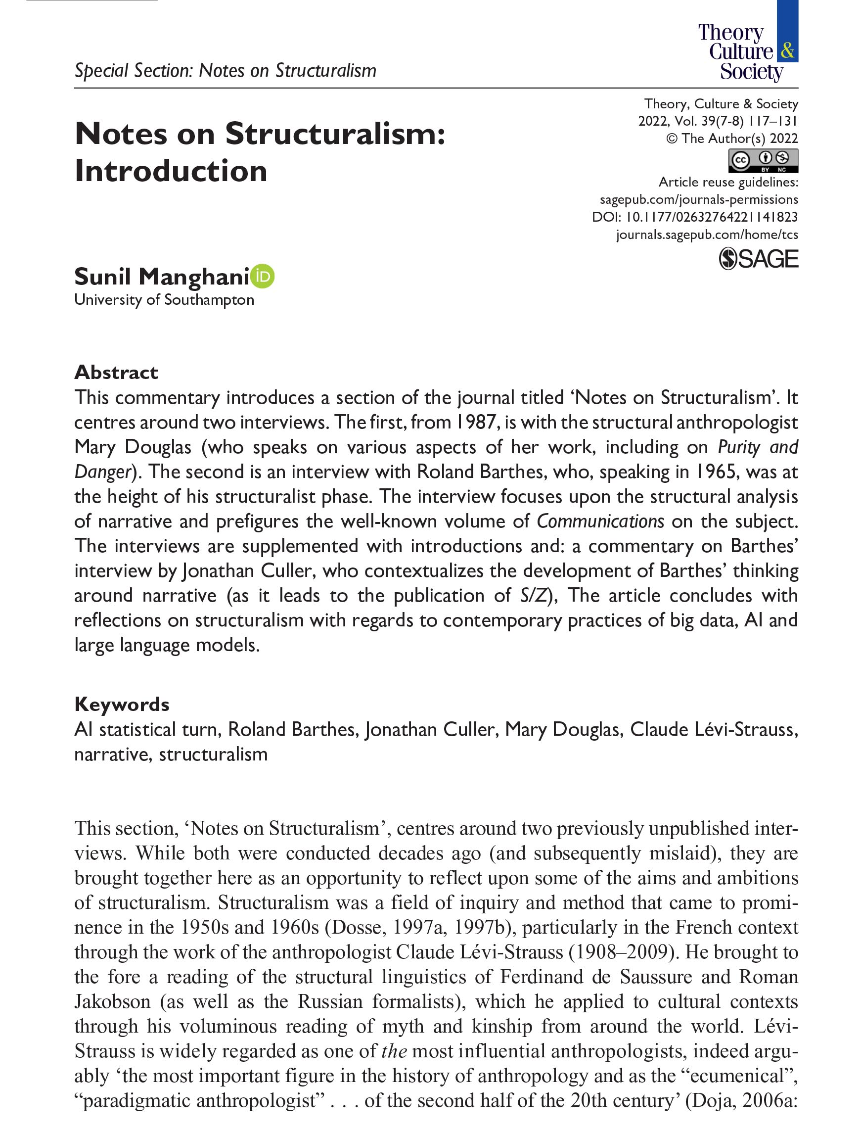 The ‘Notes on Structuralism’ special section for Theory, Culture & Society (2022, Vol. 39, No.7-8; pp.117-180) centres upon two interviews. The first, from 1987, is with the structural anthropologist Mary Douglas (who speaks on various aspects of her work, including on Purity and Danger). The second is an interview with Roland Barthes, who, speaking in 1965, was at the height of his structuralist phase. The interview focuses upon the structural analysis of narrative and prefigures the well-known volume of Communications on the subject. The interviews are supplemented with introductions and: a commentary on Barthes’ interview by Jonathan Culler, who contextualizes the development of Barthes’ thinking around narrative (as it leads to the publication of S/Z), The article concludes with reflections on structuralism with regards to contemporary practices of big data, AI and large language models.